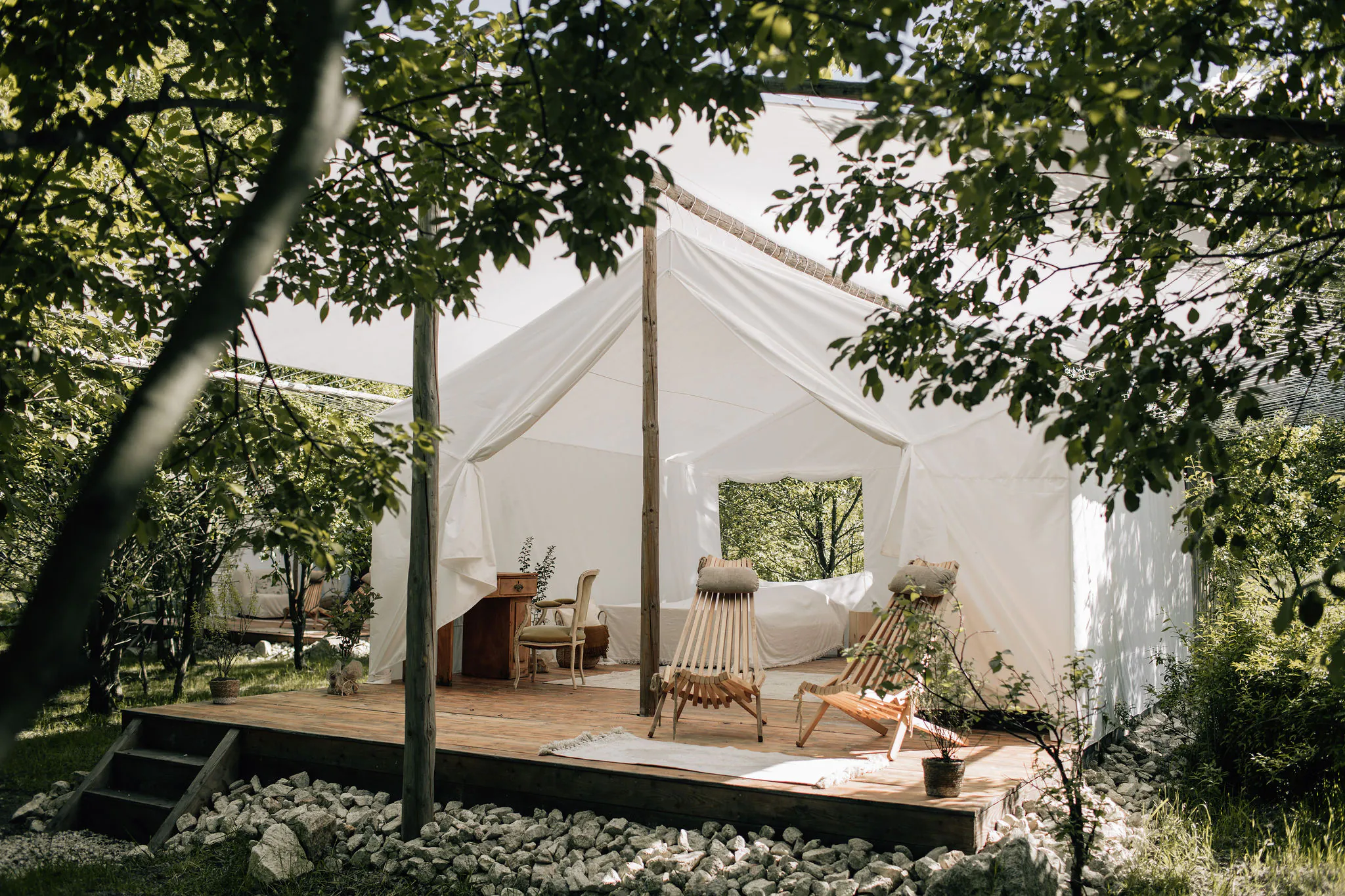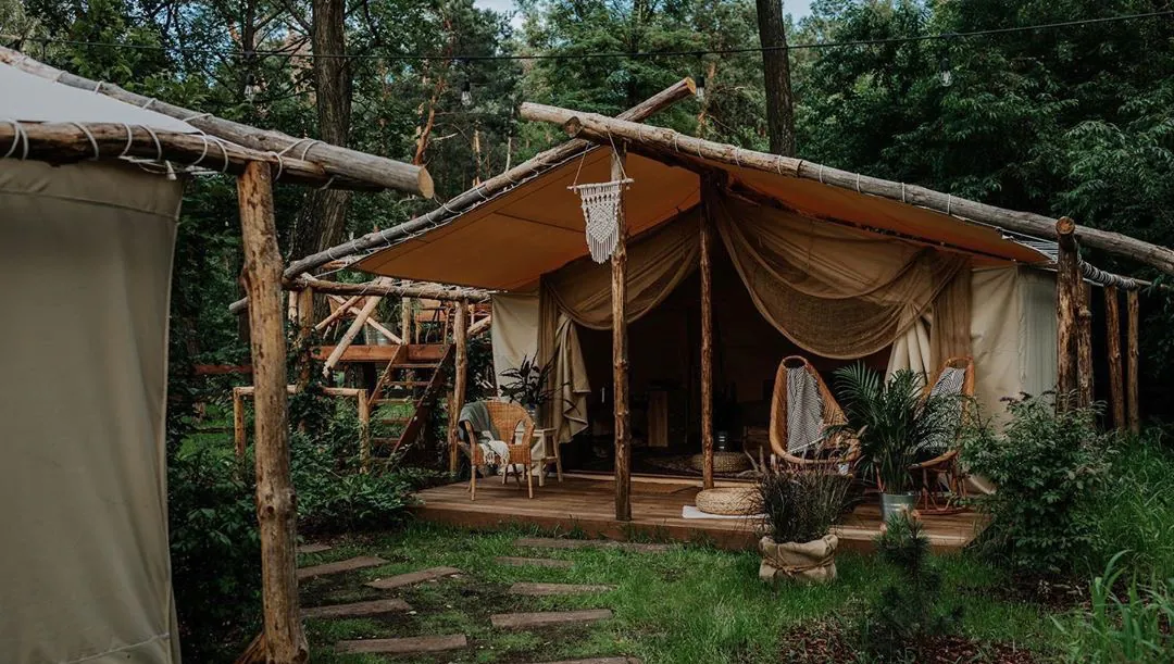 Located in Marki near Warsaw, this place is designed for creative souls seeking solace in nature without sacrificing comfort. Four tents are available, each with a different theme: Benzaiten, dedicated to the goddess of beauty and patroness of lovers, with a freestanding bathtub; Tenjin, honoring the god of knowledge, poetry, and calligraphy, with an inspiring library; Hotei, featuring a multimedia projector, easels, and paints, dedicated to the god of happiness, patron of artists and actors; and finally, Amaterasu, under the auspices of the goddess of the heavens, with its own elevated terrace. In addition to the tents, there’s a sauna overlooking the trees, an outdoor cinema, a bonfire area, handwoven hammocks, and cozy gazebos, all in the lap of nature.