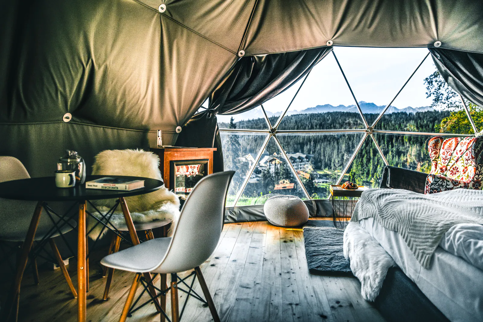 This time, we’re heading to Bukowina Tatrzańska to explore klapnioki – modern tents, or rather spherical domes. Each one offers a 30 sqm living area, along with heating and air conditioning! Inside, you’ll find a wide, comfortable double bed, a loft bed, cozy armchairs, a minibar, a fully equipped bathroom made from ecological materials with a shower cabin, and an outdoor terrace with seating. The surroundings speak for themselves – confirmed by the local mountain people!