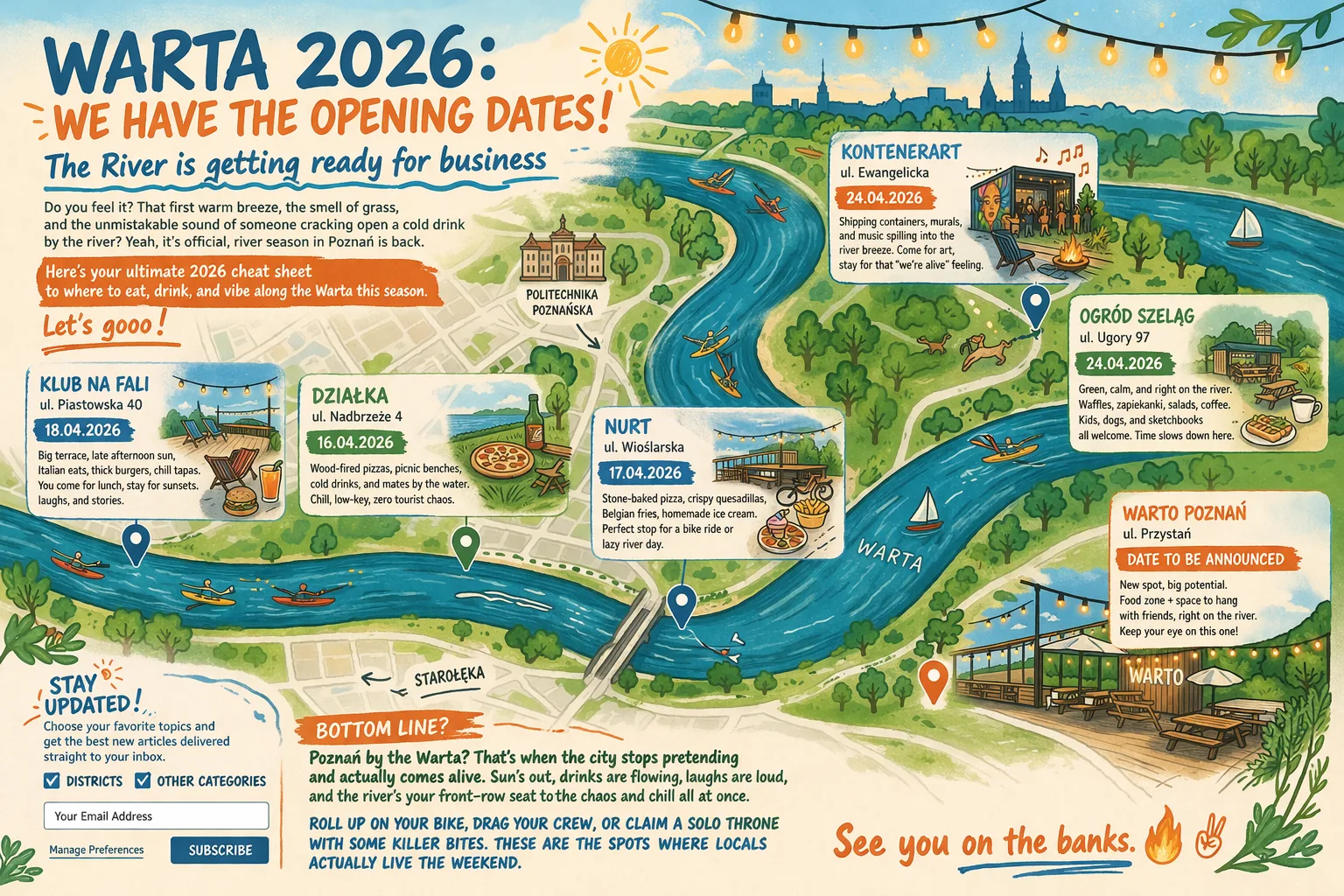 Do you feel it? That first warm breeze, the smell of grass, and the unmistakable sound of someone cracking open a cold drink by the river? Yeah, it’s official, river season in Poznań is back. Here’s your ultimate 2026 cheat sheet to where to eat, drink, and vibe along the Warta this season. Let’s gooo