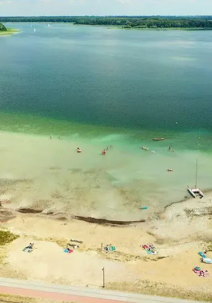 Tropicana Lake in Owińska is an artificial reservoir, and although wild landscapes are scarce here, there are plenty of attractions for the whole family. One of them is the water skiing and wakeboarding lift. The “decor” of the beach in Owińska is also unique – palm trees, reed umbrellas, and… giraffes. The lake boasts numerous amenities such as a guarded sandy beach, water sports equipment rental, playground, changing rooms, showers, and a volleyball court. You can also enjoy fast food at the bar. However, admission to the beach is charged.